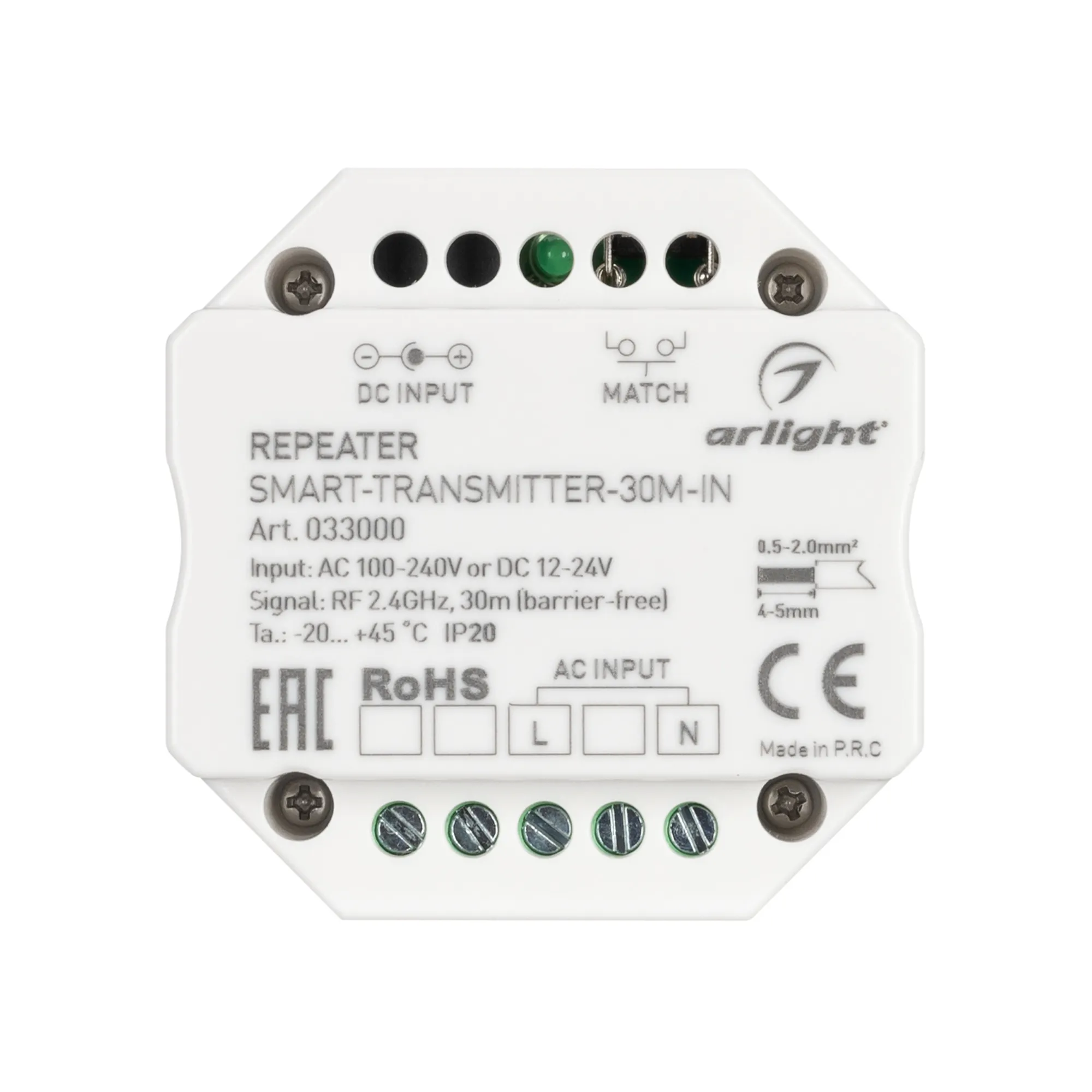 Беспроводной приёмо-передатчик радиосигнала 2.4G для расширения дальности приема сигнала диммеров и контроллеров серии SMART. Установка в подрозетник. Напряжение питания AC 100-240V и DC 12-24V, потребляемая мощность не более 0.6Вт (AC) и 0.4Вт (DC), частота радиосигнала 2.4 Ггц, дальность работы до 30 метров. Габариты 52х52х26 мм.