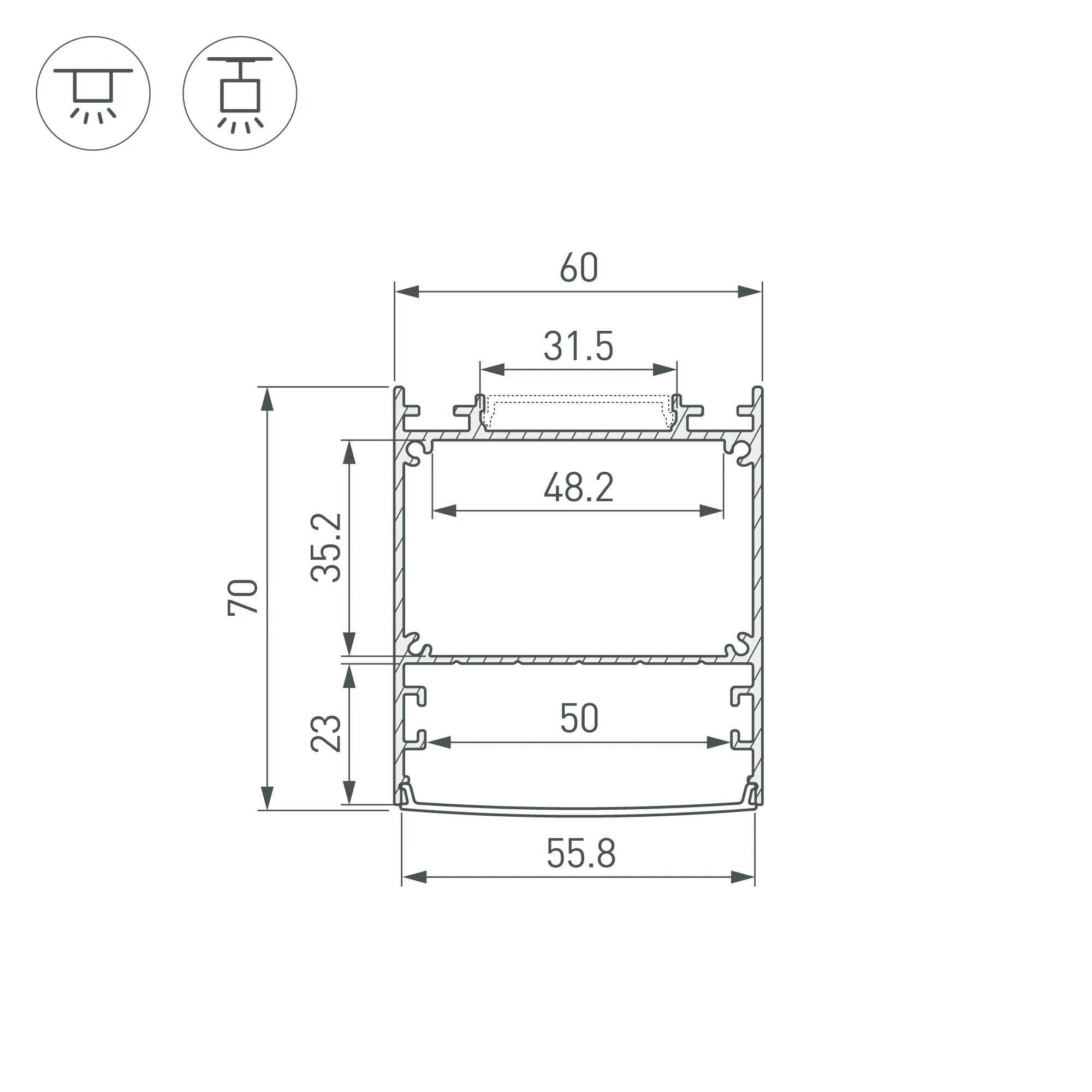 Алюминиевый анодированный профиль для светодиодных лент и линеек. Цвет - черный. Габаритные размеры (L×W×H): 2000x60x70 мм. Ширина площадки ленты направленного света 50 мм, отраженного света - 31,5 мм. Отсек для БП 48,2х35,2 мм. Экраны, заглушки и другие аксессуары приобретаются отдельно. Цена за 1 метр.