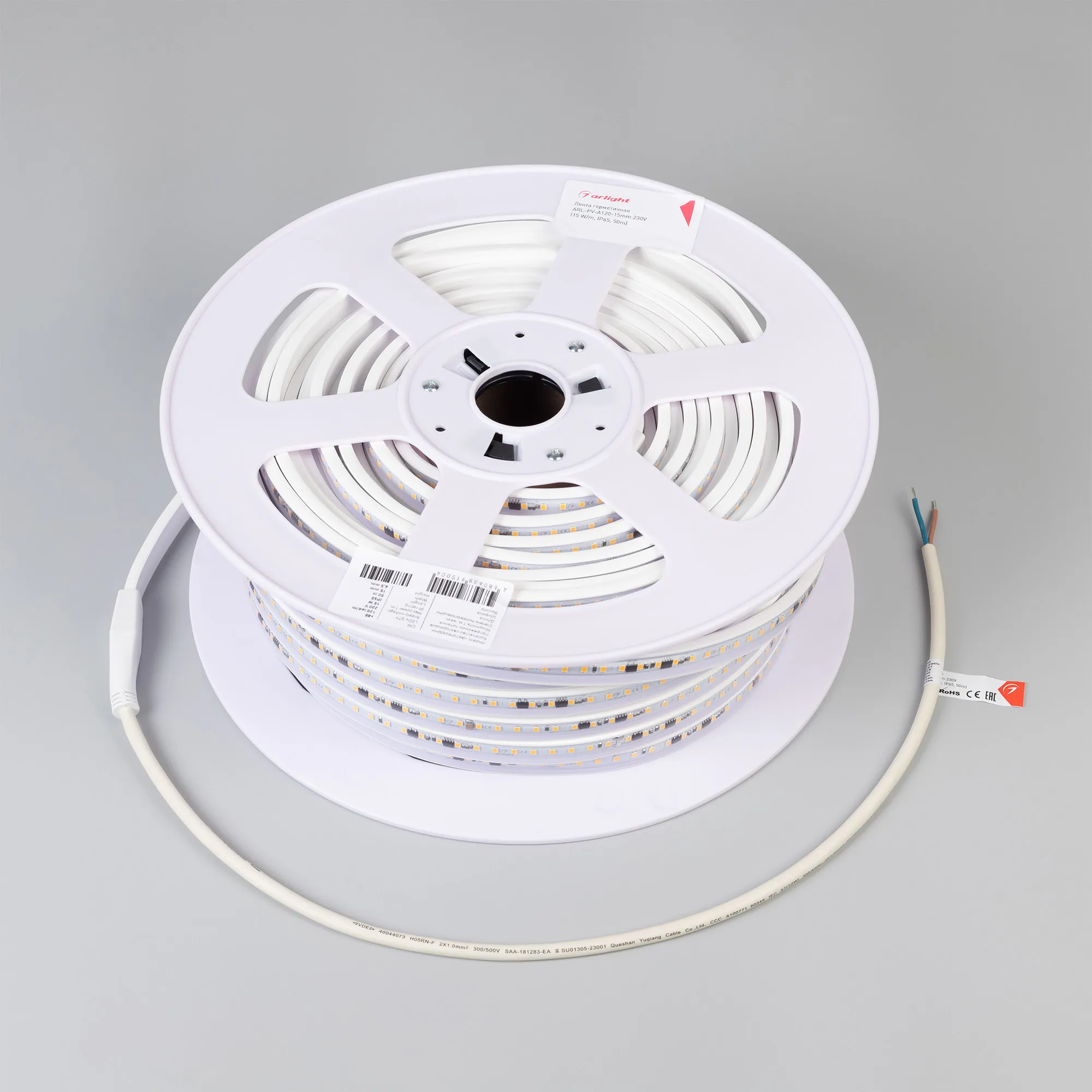 Светодиодная герметичная лента ARL серии A120, IP65 (PVC - трубка ПВХ экструзия). Светодиоды SMD 2835, 120 шт/м, белая плата шириной 12 мм, крепление на силиконовые скобы (скотч 3M отсутствует). Цвет ТЕПЛЫЙ 2700K, индекс цветопередачи CRI>85, угол 120°. Питание 230 В, мощность 15 Вт/м (750 Вт на 50 м). Размеры 50000x15x6.5 мм. Мин. отрезок 100 мм, 12 светодиодов. Цена за 1 м.