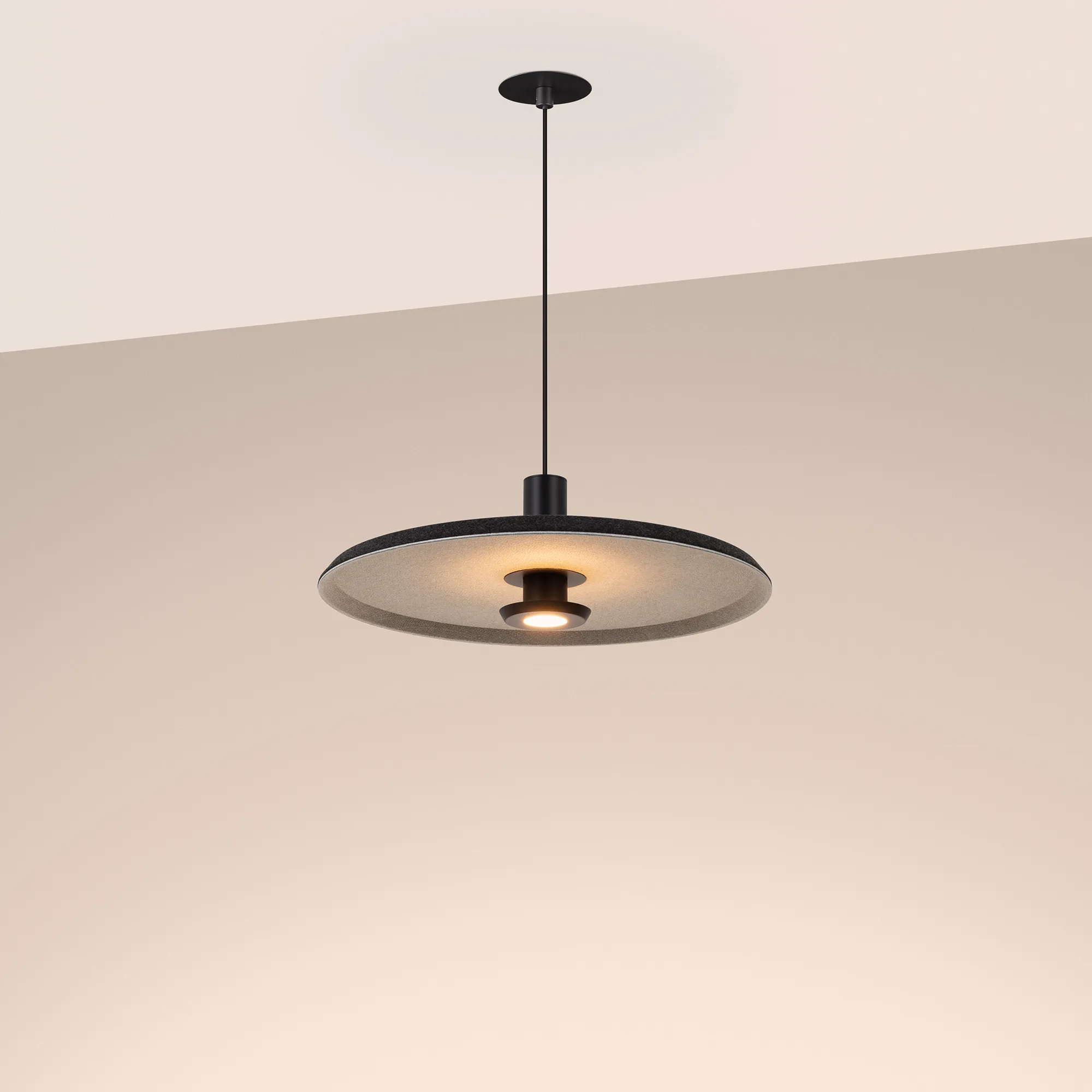 Подвесной светильник. Мощность 12 Вт, св. поток 648 лм, 64 лм/Вт, теплый 2700 K, CRI>94, угол 36°, напряжение питания 230 В. Темно-серый фигурный плафон из переработанного фетра со светло-серой внутренней поверхностью, линза-рассеиватель из PMMA, степень защиты IP20. Размер: диаметр 450 мм, высота 145 мм. Монтаж подвесной, длина подвеса 2000 мм, регулируемая. В комплекте 2 вида чаш. Габариты чаши (встраиваемая) Ø80 х 23 мм, врезное отверстие Ø60 мм. Габариты чаши (накладная) Ø120 x 35 мм. Драйвер 59В, 300 мА, пульсация <1%. Управление по TRIAC.